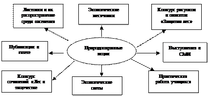 Просветительская деятельность направлена на проведение лесоприродоохранной пропаганды, разъяснительной и агитационной работы среди населения членами школьных лесничеств. Задачи просветительской деятельности: - формирование лесоэкологической культуры; - внедрение в массовое сознание понимания необходимости охраны леса как важнейшей социальной проблемы; - разъяснение каждого из аспектов этой проблемы на общих и местных примерах; - воспитание у людей чувства личной ответственности за сохранность лесов, исключающей возможность противоправного поведения в лесу; - популяризация деятельности и повышение авторитета работников лесного хозяйства и их добровольных помощников, в том числе членов школьных лесничеств; - усиление внимания к проблеме охраны леса со стороны руководителей предприятий и организаций, связанных с выполнением работ на территории лесного фонда, а также органов исполнительной власти различных уровней (рис. 6).