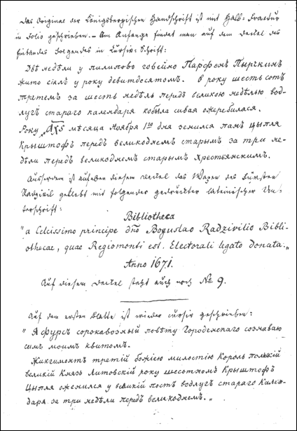 praefectus *) oder Zenonicz В данном описании листа 251об. ничего не говорится о большой и малой библиотечных печатях-орлах; значит, они появились в РС позже. Также ничего не говорится о двух карандашных фразах (про 604 рисунка и про 251 лист). Более того, утверждается, что за «Словом Святого Епифания» непосредственно следует латинский автограф. То есть, видимо, карандашные фразы имеют более позднее происхождение. Перевод (расшифровка) ЛИСТОВ Iоб. и 1 из [4] {расшифровку скорописных фраз даем по А. А. Шахматову (см. [15], т.2, с. 2 ) } Оригинал Кенигсбергской рукописи написан полууставом ин-фолио. – В начале {листа I} на крышке переплета (курсивом/скорописью) написано следующее: Двђ недђли у пилипово говеино ПР аθеН ПР ычкН й жито сеялъ у року девяТ десятоМ В року шеС сТ о третеМ за шеС недеЛ переД великоД неМ воД луГ старого калеД нара кобыла сивая ωжереБИЛА ся. ρока ≠ AXS мца мР аТ а {Л,с,е,А} дня зенился панъ цыпля Крыштофъ перед великоднемъ старымъ за три недђли передъ великоднемъ старымъ Хри... . Кроме того именно на этом переплете наклеен герб князя Радзивила со следующим печатным латинским автографом: {В настоящей работе мы (вслед за А. А. Шахматовым) не приводим ни перевода с латыни экслибриса (что несложно), ни перевода дарственной (что очень сложно: латынь варварская рукописная, с сокращениями). В отдельной работе следует провести не только расшифровку и перевод данной латыни, но и анализ метода ее написания (по наклейкам!), свидетельствующего либо об их большой древности – середина XVII века, либо о намеренном подлоге. Приведенный ниже для полноты текст дарственной по А. А. Шахматову не может, по нашему мнению, быть названным даже расшифровкой исходного.} На этом переплете стоит тоже еще № 9 {На этом листе еще стоит № 9} __________________ На первом листе {так же} снова скорописью написано: «Я фурсъ сорокавозный повђту Городенскаго сознаваю симъ моимъ квитомъ. Жикгимонтъ третiй божiею милостiю Король Польскiй великий Князь Литовскiй року шесотномъ Крыштофъ Цыпля оженился у великiй постъ водлугъ стараго Календаря за три недђли передъ великоднем.» «Перевод» скорописной кириллицы соответствует приведенному А. А. Шахматовым в [15], т.2, сноска 2 на с.2. Ясно, что этот текст не может считаться переводом на современный русский язык. Такой перевод мы не приводим здесь, поскольку он требует дополнительной, прежде всего, календарно-астрономической (весьма объемной) проверки. Перевод (расшифровка) ЛИСТА 251об. из [4] {Расшифровку латинских фраз даем по А. А. Шахматову (см. [15], т.2, с. 2 )} В конце Кенигсбергской рукописи (листы 245-250) можно найти написанный полууставом, но другой рукой, чем летопись, рассказ Игумена Даниила, который содержит краткое описание тех островов, на которые попадаешь при путешествии из Константинополя в Иерусалим. Этот рассказ сообщает о Курском князе Олеге, что он якобы в течение двух лет жил на острове Родос. – Рассказчик указывает меры в локтях и в вершках. – Кроме этого, в упомянутом описании нет ничего необычного. За этим следует (на листах 250 и 251) 1.) «Слово Св. Дорофея» Епископа Турского – о 12 Апостолах; и: 2.) «Слово Св. Епифания» о пророках и пророчицах. Эти оба отрывка (тем же/также) полууставом и той же рукою, что и вышеупомянутое «Хождение» написаны. На оборотной стороне последнего листа можно найти сразу в конце второго из названных отрывков следующее латинскими рукоп