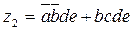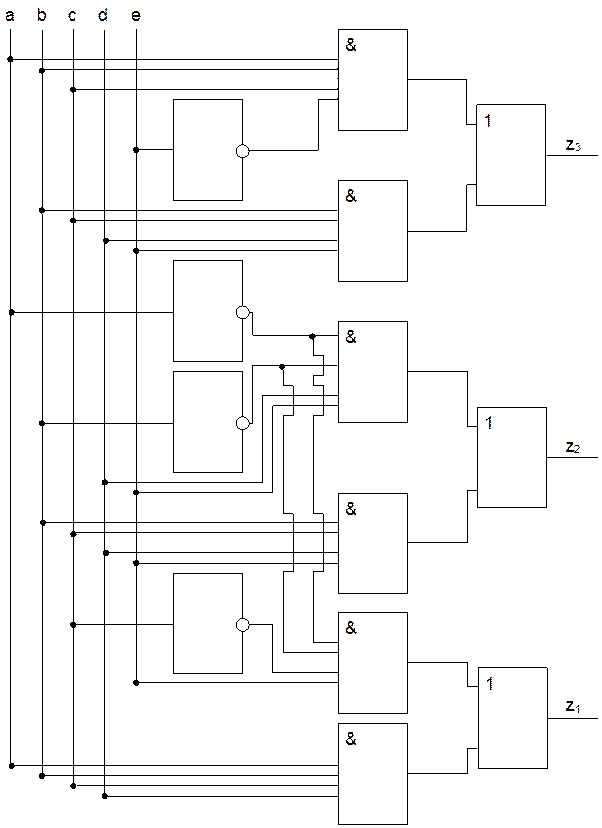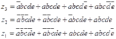 Далее для каждой из функций проведём операции неполного склеивания, в соответствии с правилами булевой алгебры. И составим импликатные матрицы для каждой из функций в отдельности. В шапке, идущей по горизонтали указываем для каждого столбца один из конъюнктивных членов функции, записанной в СДНФ. Соответственно, количество столбцов совпадает с количеством конъюнктивных членов. В шапке по вертикали записываем результаты неполного склеивания, соответственно число строк матрицы равно числу результатов неполного склеивания. Минимизация по импликатным матрицам провидится таким образом, что отмечаются в строке того или иного результата неполного склеивания те ячейки, которые соответствуют тем конъюнктивным членам, из которых склеивается этот результат. Далее выбираются только те результаты неполного склеивания, которые охватывают все столбцы импликатной матрицы. Таковые результаты неполного склеивания суммируем (проводим операцию дизъюнкции). Импликатная матрица для функции z3 1 – 2 – 2 – 3 –