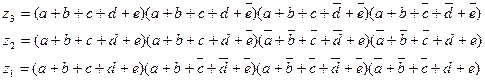 Далее для каждой из функций проведём операции неполного склеивания, в соответствии с правилами булевой алгебры. И составим имплицентные матрицы для каждой из функций в отдельности. В шапке, идущей по горизонтали указываем для каждого столбца один из дизъюнктивных членов функции, записанной в СКНФ. Соответственно, количество столбцов совпадает с количеством дизъюнктивных членов. В шапке по вертикали записываем результаты неполного склеивания, соответственно число строк матрицы равно числу результатов неполного склеивания. Минимизация по имплицентным матрицам провидится таким образом, что отмечаются в строке того или иного результата неполного склеивания те ячейки, которые соответствуют тем дизъюнктивным членам, из которых склеивается этот результат. Далее выбираются только те результаты неполного склеивания, которые охватывают все столбцы имплицентной матрицы. Таковые результаты неполного склеивания перемножаем (проводим операцию конъюнкции). Имплицентная матрица для функции z3 1 – 2 – 2 – 3 –