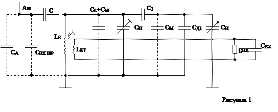 | Санкт - Петербургский Государственный Университет Телекоммуникаций им. проф. М. А. Бонч-Бруевича курсовая работа на тему «радиоприемники АМ сигналов» выполнил: студент гр. ФП-91 Мишлано Дмитрий. принял: доцент Кацнельсон Л.Н. Санкт-Петербург 2003 г. Задание на курсовое проектирование: 1. диапазон частот 7,0 – 7,4 МГц 2. чувствительность не хуже 50мВ 3. эквивалент антенны 7.5 пФ 4. ослабление по зеркальному каналу σЗК >14 дБ 5. ослабление по соседнему каналу σСК >40 дБ 6. СHmin =10 пФ 7. СН max =330 пФ 1. Эскизный расчет структурной схемы приемника 1.1 . Задачи расчета Типовая структурная схема современного приемника содержит основные узлы, изображенные на рис 1