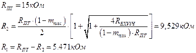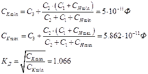 Определяем емкость конденсатора связи с антенной, недостающие данные берем из справочных материалов: Определяем емкость, вносимую в контур из антенной цепи Для схемы 3 определяем емкость дополнительного конденсатора, включенного в контур Для схемы 4 уточняем значение емкости подстроечного конденсатора Определяем допустимое значение показателя связи колебательного контура с АП1 из условий: - заданного расширения полосы - минимизация коэффициента шума АП1 Выбираем большее из этих двух значений и обозначаем А1 min . Рассчитываем коэффициент включения колебательного контура во входную цепь АП1 и индуктивность катушки связи Рассчитываем трансформирующий множитель, определяющий долю энергии, передаваемый из антенной цепи в колебательный контур При КД <1.1 расчет можно производить на одной (лучше максимальной) частоте диапазона. Определяем следующие параметры: - характеристическое сопротивление - сопротивление потерь в катушке - сопротивление связи колебательного контура с АП1 - сопротивление, вносимое в колебательный контур из входной цепи АП1 - сопротивление потерь эквивалентного колебательного контура - коэффициент расширения полосы пропускания - добротность входного устройства - показатель связи колебательного контура с АП1 - проводимость эквивалентного генератора - коэффициент передачи входного устройства 3 . Расчет гетеродина 3.1. Расчет сопряжения настроек гетеродина и преселектора Параметры элементов колебательного контура гетеродина при известных параметрах контура преселектора выбирают из соображений обеспечения сопряжения настроек гетеродина и преселектора с допустимой погрешностью. Контур гетеродина перестраивается в диапазоне частот от До Контур гетеродина имеет коэффициент перекрытия по частоте Задача состоит в определении числа точек и частот точного сопряжения, структуры и параметров гетеродина. При использовании идентичных элементов настройки в преселекторе и гетеродине точное сопряжение возможно только в одной, двух или трех точках диапазона. 3 .2. Выбор числа точек точного сопряжения Число точек точного сопряжения определяется значением коэффициента перекрытия по частоте рассчитываемого диапазона КД . При КД ≤1,1 (КД = 1,057) достаточно одной точки точного сопряжения, частота которой рассчитывается по формуле При условии равенства абсолютных погрешностей сопряжения в худших точках диапазона максимальная относительная погрешность сопряжения рассчитывается следующим образом: 3 .3. Сопряжение в одной точке В этом случае структура и все емкости гетеродина выбирают такими же, как у контура преселектора. В процессе налаживания приемника с помощью подвижного сердечника катушки гетеродина осуществляют точное сопряжение (подстройку) на частоте f1 .