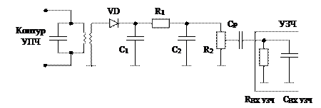 4. Расчет диодного детектора АМ сигналов Исходными данными для расчета всех детекторов являются: - значение промежуточной частоты fПЧ ; - допустимые амплитудные искажения на нижних и верхних частотах модуляции МН =МВ =1,1; - входное сопротивление (RВХУЗЧ =51 кОм) и емкость (CВХ УЗЧ =0,1 пФ) выбранной ИМС УЗЧ Принципиальная схема диодного АД: