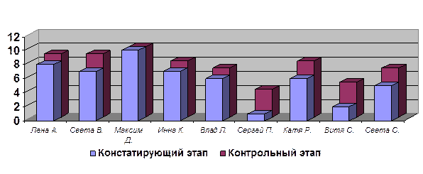 Для выявления эффективности использования алгоритмов в обучении учащихся 3-го класса математике, мы провели исследование, которое проводилось в три этапа. На первом этапе эксперимента мы провели констатирующий срез для определения глубины и прочности программных знаний, умений и навыков учащихся по математике. Второй этап эксперимента – формирующий – заключался в проведении с учащимися занятий по математике с использованием алгоритмов. На третьем этапе – контрольном – нами был определен итоговый уровень глубины и прочности программных знаний, умений и навыков учащихся по математике и проведен анализ полученных результатов. Итак, цель эксперимента: выявление эффективности использования алгоритмов в обучении учащихся 3-го класса математике. В исследования приняли участие 9 учеников 3 класса Лунинской школы Лунинецкого района Брестской области. Для проведения констатирующего среза нами был проведена проверочная работа (приложение 1). Результаты проверочной работы отражены в таблице 1, где знаком «+» отмечены правильно выполненные задания (приложение 2). Из таблицы 1 видно, что дети имеют разные уровни знаний, умений и навыков: · большинство детей – 6, что составляет 66,7%, выполнили от 5 до 8 заданий правильно; · два ученика (22,2%) смогли решить только 1-2 задачи; · и только 1 испытуемый (11,1%) смог выполнить правильно все задания. На формирующем этапе нами были проведены занятия по математике с использованием алгоритмов (примерные конспекты уроков – приложение 3). На заключительном – контрольном – этапе эксперимента мы провели контрольный срез для определения глубины и прочности программных знаний, умений и навыков учащихся. Для проведения среза мы опять использовали проверочную работу, по результатам которой была составлена таблица 2 (приложение 4). Сравнивая результаты констатирующего и контрольного этапов эксперимента можно заметить, что показатели знаний детей значительно улучшились. Динамику изменения уровня знаний учащихся мы представили на диаграмме 1. На диаграмме отражено количество правильно выполненных во время проверочных работ заданий. Диаграмма 1