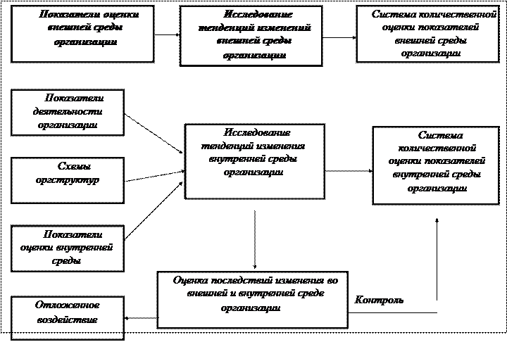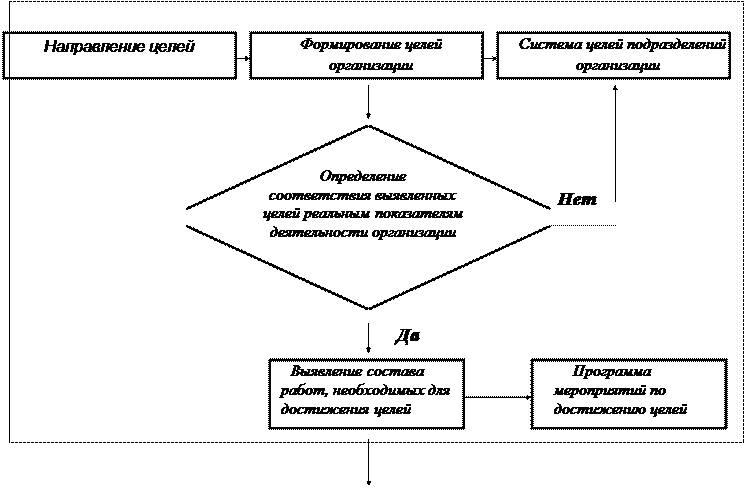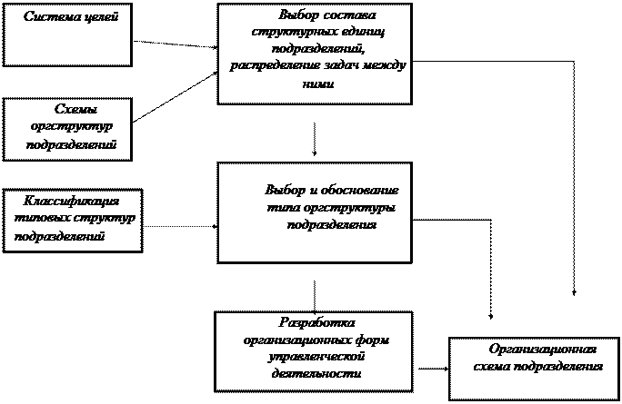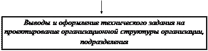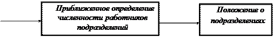 Рис.1. Алгоритм формирования организационной структуры Экспертно-аналитический метод позволяет оценить в баллах тенденции развития внутренней среды организации и его подразделений. Эти тенденции динамичны и обычно вызывают появление проблемных задач, требующих изменения целей деятельности организации и его подразделений. Определите возможности (потери) организации, качественно оценить последствия изменений во внешней и внутренней среде, выявить срочность таких управляющих воздействий, как контроль, отсутствие воздействия, отложенное воздействие, немедленное воздействие. Этап 2. Формирование целей организации На основе выявленных проблемных задач организации (подразделения) и ориентировочного перечня целей сформируйте дерево целей организации (подразделения) и определите соответствие поставленных целей реальным показателям деятельности организации. Выявляется состав работ, необходимых для достижения целей организации в целом на основе передового опыта решения задач в существующих управленческих системах , использования прогрессивных решений в организационной, технической, экономической, социальной сферах, а также обеспечения оптимальных условий функционирования системы управления и сокращения затрат на ее содержание. На данном этапе состав работ определите укрупнено с учетом основных задач управления, решаемых фирмой. В дальнейшем после уточнения задач состав работ может быть скорректирован. Входная и выходная информация по каждой работе может также определяться укрупнено. Например, для конструирования изделий входная информация - техническое задание на разработку изделия, выходная - конструкторская документация. Этап 3. Разработка общей схемы организационной структуры организации С учетом системы целей и программы мероприятий по их достижению сформируйте состав структурных единиц (отделов, бюро, секторов, лабораторий, групп и т.д.) по подразделениям и распределяются задачи между ними. Затем определите и обоснуйте тип организационной структуры организации. Для этого разработайте схемы организационной структуры подразделений с учетом уровней управления, централизации и децентрализации полномочий и ответственности, с учетом перспектив развития управляющей системы и др. На этом же этапе проведите ориентировочнаую оценка эффективности и трудоемкости работ, выполняемых собственными силами или с привлечением сторонних организаций. Полученные оценки сравните. Например, конструкторская документация на изделия основного производства может разрабатываться фирмой, а оснастка - смежными организациями. Для решения научных задач возможна кооперация в рамках временных научных подразделений. Проектная документация на строительство и реконструкцию может разрабатываться как собственными силами организации, так и сторонними проектными организациями. Машинное время может быть арендовано и т.д. Могут быть созданы временные коллективы, отдельные структурные подразделения. Результат данного этапа - формирование схемы организационной структуры организации, подразделения. Этап 4. Определение квалификации и численности работников подразделений организации Определите численность работников в каждом подразделении, сформулируйте требования к руководителям и персоналу. Возрастающая сложность ре