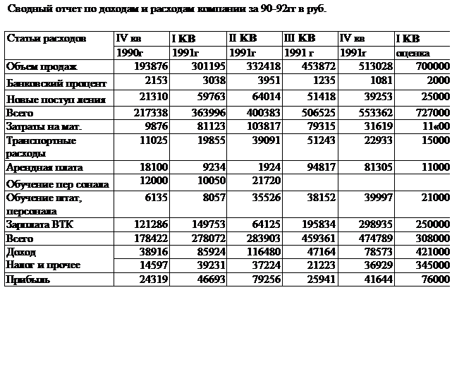 «КАМ компания» Одним октябрьским утром 1990 г. Алексей Михайлович Комкаров -основатель и генеральный директор «КАМ компани» собрал своих партнёров для обсуждения возможности покупки печатного оборудования. Компания была создана Комкаровым в Москве почти два года тому назад и уже успела диверсифицировать свой бизнес в следующих областях: разработка компьютерных программ, брокерство, производство запасных частей для автомобиля, печатное дело. До этого Комкаров вёл в различных областях поиск печатного оборудования для получения его в аренду или в лизинг. Приобретение такого оборудования мог бы сделать печатный бизнес самоокупаемым. Как раз сегодня утром ему позвонил один из его старых друзей и предложил купить у него печатное оборудование. Проблема была в том, что позвонившему другу нужны были только наличные деньги. Компания уже заняла в банке 40 тыс.руб. и только что потратила 200 тыс. руб на покупку акций на Российской товарно-сырьевой бирже (РТСБ). Комкаров должен был быстро решить: покупать ли оборудование, а если «да», то чем и как платить за него. Однако на деле он смотрел глубже. Его компания выжила и росла, т.к. пыталась использовать любую возможность для этого. Таким образом, она стала диверсифицированной организацией. Стыковались ли её разные по природе виды бизнеса? Стоило ли продолжать процесс диверсификации? Какой он видел свою компанию в будущем, и каков должен быть её статус? История компании «КАМ», Комкаров был главным «двигателем» компании. Он был кандидатом экономических наук, кроме экономического имел и юридическое образование, владел английским и французским языком и несколько лет проработал в Индии. Коллеги его уважали и считали человеком здравого смысла с амбициями. Весной 1989 г. одна организация попросила группу научных работников разработать компьютерную программу в области авиастроения. Взявшись за эту работу, как за временный приработок и оставаясь на полной ставке в своих организациях (учебные заведения и НИИ), члены группы быстро создали компьютерную программу высокого качества в заказанной области. Этот заказ и положил начало создания компании. Она сначала возникла, как научно-внедренческий кооператив «КУП». В то время это была единственная юридическая форма для существования частного бизнеса ( в Приложении в табл.1 приводятся данные об истории компании, а в табл.2- информация о кооперативном движении того времени). Рассматриваемый период был известен тем, что в обществе создалось негативное отношение к кооперативам, что затрудняло взаимоотношения с клиентами - государственными предприятиями. Клиенты хотели иметь дело с исполнителями, имеющими положительный имидж у общественности. Это заставило Комкарова создать негосударственное предприятие с учредителем в лице государствбенной или общественной организации. Этот новый статус в потенциале мог сделать бизнес более эффективным, чем это было в рамках кооператива, поскольку предоставляло возможность передачи технологии или других «ноу-хау» (компьютерные программы). После долгих и утомительных поисков весной 1990г. удалось найти нужного учредителя в лице «общественной организации при одном из райисполкомов г.Москвы и кооператив был преобразован в научно-производственное объединение (НПО) с добавлением аббревиатуры инициалов его основат
