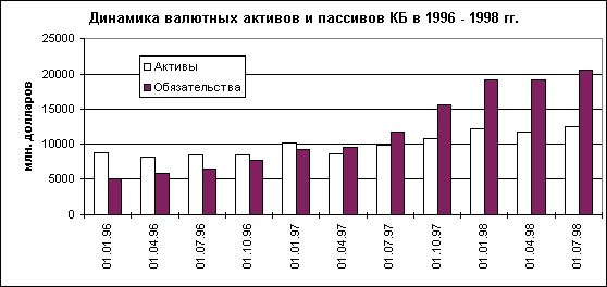 Источник: ЦЭК, ИА "Финмаркет", ИЭППП. Таким образом, снижение процентных ставок, вызывающее рост кредитных вложений в экономику, по видимому привело к определенному оживлению экономической активности. При этом следует отметить, что в ситуации возобновления роста после значительного (в 2 раза и более) падения производства инвестиционный фактор на первых порах не является решающим. Рост происходит как реакция на увеличение спроса (в нашем случае как следствие роста реальных доходов населения) и в основном за счет использования и обновления имеющихся мощностей. Именно это и происходило в России 1997 году. Однако и при этих предпосылках общее снижение инвестиций делает рост неустойчивым. Схоже обстоит дело и производительностью труда. Хотя в 1997 году произошел некоторый рост этого показателя, рассчитываемого по ВВП (причем темпом, превышающим рост ВВП), уже в начале 1998 года динамика его резко изменилась на противоположную. В условиях быстрого роста курса доллара в 1992 - 1994 годах в структуре активов коммерческих банков преобладали валютно номинированные кредиты. Быстрое обесценение рублевых обязательств позволяло финансировать даже малоэффективные, в валютном выражении проекты. При относительно стабильном курсе рубля ситуация изменилась: высокая реальная ставка по рублевым обязательствам требовала более эффективного размещения активов. Поэтому в 1995 -1996 годах происходил процесс увеличения величины валютно номинированных пассивов коммерческих банков. В первом квартале 1997 года их величина превысила валютные активы банков (см. рисунок 1.4). При этом за год к концу первого квартала 1998 года валютные обязательства коммерческих банков выросли примерно в два раза с 9,5 млрд. долл. до 19,2 млрд. долл. На 1 июля 1998 года их величина достигла 20,5 млрд. долл. Это увеличение было следствием быстрого роста привлекаемых ссуд и займов при относительно стабильной величине текущих валютных счетов и депозитов (см. рисунок 1.5). Валютные активы за этот период возросли примерно до 12,1 млрд. долл. Причем рост происходил в основном за счет увеличения выдаваемых кредитов (см. рисунок 1.6). Очевидно, что такая структура баланса банковской системы (наряду с ее общей слабостью в финансовом отношении, вызванной протекционистским отношением государства к большинству крупных банков) сделала ее крайне уязвимой к девальвации национальной валюты. Кроме того, высокие объемы иностранных кредитов привлекались под залог ценных бумаг, падение котировок которых в ходе развития финансового кризиса, потребовавшее довнесения средств на депозитные счета, инициировало начало развертывания банковского кризиса. Рисунок 1.4.