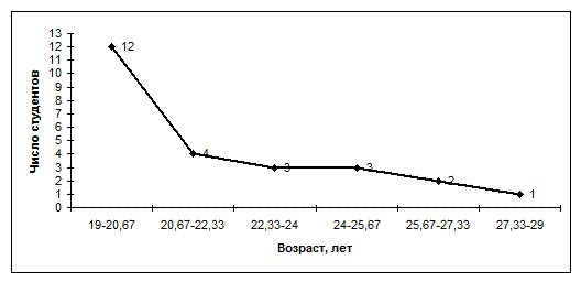 На основе этой группировки строится график распределения возраста студентов (рис.2).