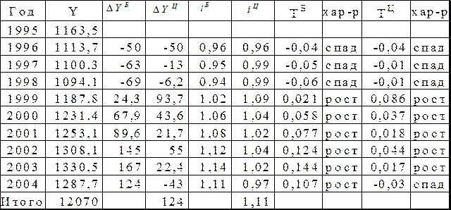 Вычислить: абсолютные, относительные, средние изменения и их темпы базисным и цепным способами. Проверить ряд на наличие в нем линейного тренда, на основе которого рассчитать интервальный прогноз на 2005 год с вероятностью 95%. Решение. Любое изменение уровней ряда динамики определяется базисным (сравнение с первым уровнем) и цепным (сравнение с предыдущим уровнем) способами. Оно может быть абсолютным (разность уровней ряда) и относительным (соотношение уровней). Базисное абсолютное изменение представляет собой разность конкретного и первого уровней ряда (47), а цепное абсолютное изменение представляет собой разность конкретного и предыдущего уровней ряда (48). По знаку абсолютного изменения делается вывод о характере развития явления: при В нашей задаче эти изменения определены в 3-м и 4-м столбцах таблицы 5. Для проверки правильности расчетов применяется правило, согласно которому сумма цепных абсолютных изменений равняется последнему базисному. В нашей задаче это правило выполняется: Базисное относительное изменение представляет собой соотношение конкретного и первого уровней ряда (49), а цепное относительное изменение представляет собой соотношение конкретного и предыдущего уровней ряда (50). Относительные изменения уровней — это по существу индексы динамики, критериальным значением которых служит 1. Если они больше ее, имеет место рост явления, меньше ее — спад, а при равенстве единице наблюдается стабильность явления. В нашей задаче эти изменения определены в 5-м и 6-м столбцах таблицы 5. Вычитая единицу из относительных изменений, получают темп изменения