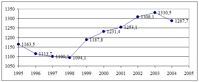 Рис.4. График динамики смертности от болезней системы кровообращения в РФ. Из данного графика видно, что есть все основания принять уравнение тренда в виде линейной функции. Определение параметров