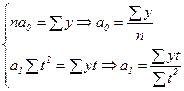где n – количество уровней ряда; t – порядковый номер в условном обозначении периода или момента времени; y – уровни эмпирического ряда. Эта система и, соответственно, расчет параметров При таком порядке отсчета времени (от середины ряда)