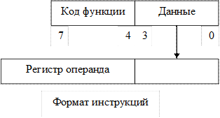 Регистры транспьютера Регистры А, В, и С формируют вычислительный стек и являются источником и приемником для большинства арифметических и логических операций. Для вычисления выражений используется вычислительный стек. При этом инструкции обращаются к этому стеку неявным образом. Например, инструкция add складывает два верхних элемента стека и помещает результат в верхушку стека. При проектировании было учтено, что транспьютер будет программироваться на языке высокого уровня. Поэтому набор инструкций подобран для простой и эффективной компиляции. Инструкции одинакового формата, наиболее часто встречающиеся в программах. Набор инструкций не зависит от разрядности процессора, что позволяет один и тот же микрокод использовать для транспьютеров различной разрядности. Каждая инструкция занимает 1 байт, разделенный на 2 четырехбитных поля. Непосредственные функции Имеется 16 функций, у которых значение операнда находится в пределах 0 – 15. 13 из них используются для представления наиболее важных функций, выполняемых любым компьютером. Сюда входят: