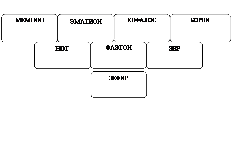 Мемнон – сын Эос и Титона, царь эфиопов. Эматион - сын Эос и Титона, былубит Гераклом во время похода героя за яблоками Гесперид (одиннадцатый подвиг Геракла). Борей – сын Эос и Астрея, олицетворение северного бурного ветра. Нот - бог южного ветра, сын Астрея и Эос. Фаэтон - сын Эос и Кефала. Эвр - божество восточного утреннего ветра, сын Астрея и Эос. Зефир – западный ветер. СПИСОК ИСПОЛЬЗОВАННОЙ ЛИТЕРАТУРЫ С. Д. Артамонов «Литература Древнего Мира», Просвещение, 1988, стр. 86-88. И.Н.Лосева...Н.С.Капустин, В.Г. Тахтамышев «Краткий мифологический словарь», Феникс, 1997, стр. 349, 540. http://greekroman.ru/nix.htm http://greekroman.ru/eos.htm http://en.wikipedia.org/wiki/Eos http://en.wikipedia.org/wiki/Nyx_%28mythology%29 |