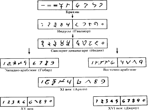 В Индии математика зародилась примерно тогда же, когда и в Египте, – пять с лишним тысяч лет назад. К началу нашего летоисчисления индийцы уже были замечательными математиками. Кое в чем они обогнали даже древних греков. Однако Индия была оторвана от других стран, – на пути лежали тысячи километров расстояния и высокие горы. Индийские ученые сделали одно из важнейших в математике открытий. Они изобрели позиционную систему счисления – способ записи и чтения чисел. Чтобы назвать большое число, индийцам приходилось после каждой цифры произносить название разряда. Это было громоздко, неудобно, и индийцы стали поступать иначе. Например, число 278 396 читали так: два, семь, восемь, три, девять, шесть – сколько цифр – столько слов. А если в числе не было какого-нибудь разряда, как, например, в числах 206 или 7013, то вместо названия цифры говорили слово «пусто». Чтобы не получалось путаницы, при записи на месте «пустого» разряда ставили точку. Позднее вместо точки стали рисовать кружок, который на языке хинди назывался «сунья», что значит «пустое место». Арабские математики перевели это слово на свой язык. Вместо «сунья» они стали говорить «сифр», а это уже знакомое нам слово. Слово «цифра» по наследству от арабов досталось и нам. Генеалогия современных цифр.