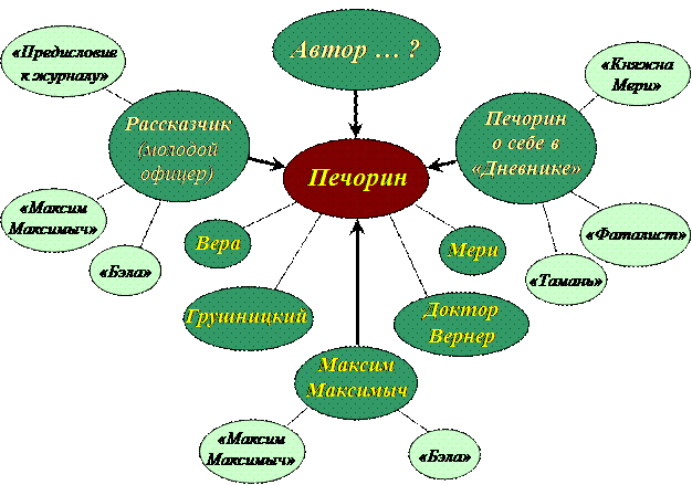 На этом этапе осмысления обучаемый вступает в контакт с новой информацией или новыми идеями. В данной практической ситуации он находит возможность увидеть выводы не только о стихотворениях, ранее изученных, но и совсем ему незнакомых. На этапе рефлексии происходит возврат к результатам групповой мозговой атаки, сравнение первоначальных знаний со знаниями после прочтения статьи. Этот вид деятельности предполагает сопоставление с уже записанными на листе ватмана замечаниями новых «инсертных» (карандашных) знаний из статьи, прочитывание их, обсуждение. Появляются дискуссии, споры, цитирование статьи. На последней стадии рефлексии мы выясняем, что у нас получилось, какие новые знания мы приняли. Почему важно было рассматривать философскую лирику Пушкина в контексте современности. Какие философские стихи Пушкина выучу или из каких выпишу цитаты. Создание кластера по заданной теме Работа с кластерами – это пробуждение интереса к художественному тексту путем графических изображений рефлексии над текстовым и внетекстовым материалом. Рисунок кластера («гроздья») – это модель, где есть центр, т. е. тема размышлений, наблюдений, занятий, и есть крупные смысловые единицы, которые соотносятся по форме и соединены прямой линией с центром. Каждая смысловая единица, в свою очередь, имеет свои уровни и подуровни размышления. Прежде чем мы на уровне начинаем создавать кластер, мы разбиваем предмет обсуждения на элементы. Ребята часто меняют структуру гроздьев, чтобы избежать однообразия. Чтобы установить причинно-следственные связи между смысловыми единицами, мы рисуем стрелочки в местах их соединения. Работа над созданием кластера по определенной теме может начаться с разработки самого кластера исследования или даже хода урока. Здесь интегрированы различные методы научной деятельности: систематизация и обобщение материала, расположение его в определенной соотнесенности, т. е. классификация, выделение главного, установление причинно-следственных связей смысловых единиц художественного текста. Хорошо, если ребята делают презентации своих работ, при этом используя для создании кластера карандаши разных цветов. Во время обсуждения созданной модели рассуждения нужно попросить ученика, представляющего ее, показать степень значимости толстых и тонких линий, больших и меньших окружностей, т. е. показать, как он устанавливал связи между смысловыми единицами полученной схемы. Учащимся 10 класса предложено создать кластер «Печорин в оценке персонажей романа и самого автора».