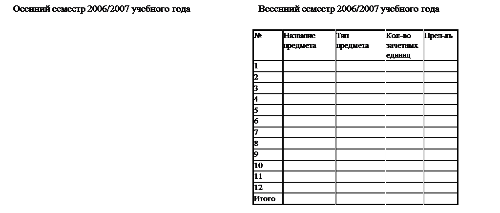 Приложение 3 (продолжение) Составлено «__» мая 2006 г. Подпись студента______________________________ Принято тьютором «__» мая 200__ г. Подпись______________________________________ Окончательный учебный план на осенний семестр 200_/200_ учебного года студента_____________________ принят при отсутствии корректировок в первоначальном учебном плане. Подпись___________________________ Дата_______________________ Тьютор «___» _______________________________ Подпись____________________________________ Окончательный учебный план на весенний семестр 200_/200_ учебного года студента_____________________ принят при отсутствии корректировок в первоначальном учебном плане. Подпись___________________________ Дата_______________________ Тьютор «___» _______________________________ Подпись____________________________________ Приложение 4 Календарно-тематический план Дисциплина _____________ Курс _______ Общая трудоемкость (кредиты/часы) ____________ Аудиторная работа (часы) ______, в т.ч. лекции ____, семинары _____ Самостоятельная работа (часы) ____________ Контактные часы ____________ Аудиторная работа