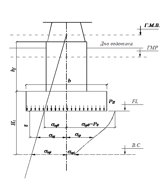 Рис. 3. Схема для расчета осадок методом суммирования. Г.М.В. – отметка горизонта меженных вод; Г.М.Р. – отметка глубины максимального размыва; FL – отметка подошвы фундамента; В.С. – нижняя граница сжимаемой толщи; PII – среднее давление под подошвой фундамента; P0 – дополнительное давление на основание;