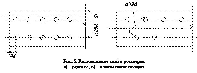 а) б) Для облегчения производства работ желательно сваи размещать в плане ростверка правильными рядами, если ширина плиты ростверка позволяет устраивать расстояние между осями свай а ≥ 3d . При меньшей величине «а » обязательно шахматное расположение (рис. 5). Расстояние от края ростверка до оси крайнего ряда свай ак зависит от точности погружения свай в грунт или их изготовления. Для забивных свай это расстояние чаще всего принимается равным размеру поперечного сечения сваи. При жестком сопряжении свайного ростверка со сваями расстояние от края ростверка (плиты) до ближайшей сваи (т.е. свес плиты) принимается не менее 0,25 м.