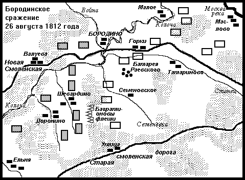 Бородинское сражение26 августа 1812 года Русская армия встала в 125 км от Москвы. Здесь близ села Бородино, Кутузов решил дать французам генеральное сражение. Силы Французов все еще были больше русской армии и выиграть битву было не возможно. Тем не менее только что прибывший Кутузов почему то решил это сражение дать. Это, вероятно, была необходимость т.к. его вызвали сюда с Туркской границы не здавать Москву, а “бить Французов”. Маршал это понимал, потому и дал бесполезное для победы сражение. Действительно, несмотря на то, что Русские защищались их потери составили примерно такое же количеств. что и у Французов, хотя моральный дух у русских солдат поднялся, в отличии от неожидающих такого поворота дела французов. Бесспорно прийти к такому исходу битвы Кутузову помогла и местность, которая выбиралась со сей тщательностью. Выбор пал на Бородинское поле. Для этого было несколько важных причин. Во-первых, через него идут новая и старая Смоленские дороги. Заняв здесь оборону русская армия преграждала Наполеону путь к Москве, хотя отстоять ее Кутузов вряд-ли мог надеяться. Во-вторых, все поле перегораживает речка Колоча. Ее форсирование не представляет труда, но расчет был, вероятно, на то, что делать это прийдется под огнем, что повлечет большие потери. Бородинское поле очень просторно, что открывало возможность для маневров. Действительно в те времена битва представляла собой встречу двух шеренг. О другом варианте битвы даже подумать никому прийти в голову не могло!!! Значит выбор ложился на это поле почти однозначно. Это объясняет то, что естественных укреплений здесь мало. Только Курганная высота в центре, где расположилась "батарея Раевского" и большой холм у деревни Шевардино куда поставили вторую огневую точку "Шевардинский редут". Других значимых позиций не было, потому кое где насыпали в спешке земли, которая не могла дать особого преимущества защищающейся стороне. Действительно, весь левый фланг оставался слабозащищенной, что должно было привлечь внимание Кутузова: Шевардинский редут выдался далеко вперед, а за ним особых укреплений не было Наполеон должен был наступать оттуда, несмотря на Колочу. Но, как уже было сказано, другого открытого места рядом не было, а сражение дать было надо. 24 августа 35 тысяч Французов пошли в первую атаку на Шевардинский редут. Их прикрывали 180 орудий. Противостояли им всего 12 тысяч русских солдат во главе с генералом Андреем Ивановичем Горчаковым. Кутузов понимал, что рано или поздно редут будет взят распорядился начать насыпать Семеновские они же Багратионовы флеши. Строительство шло не в полную силу так как к моменту потери Шевардино они были далеко не готовы и только за ночь их доделали до чего-то похожего на укрепление. У Горчакова вряд-ли была другая задача, чем максимально задержать Французов. На помощь Горчакову была послана Кирасирская дивизия. К ее подходу редут был сдат, но вскоре снова занят Русскими войсками. Пока свою задачу Кутузову выполнять удавалось. При наступлении темноты редут снова был сдат, но Кутузов отдал приказ отойти к Семеновским флешам. Свою цель Французы достигли, но и русские успели укрепиться. Войска после потери Шевардино