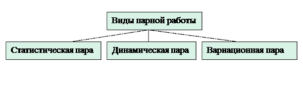 1. статическая пара, которая объединяет по желанию двух учеников, меняющихся ролями «учитель» - «ученик», так могут заниматься два слабых ученика, два сильных, сильный и слабый при условии взаимного расположения; 2. динамическая пара: выбирают четверо учащихся, и готовится одно задание, но имеющее четыре части; после подготовки своей части задания и самоконтроля школьник обсуждает задание трижды с каждым партнером, причем, каждый раз ему необходимо менять логику изложения, темп, то есть включать механизм адаптации к индивидуальным особенностям товарищей. Работа в динамических парах: