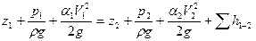 Основным уравнением, применяемым при расчете простых трубопроводов, является уравнение Бернулли. Для двух сечений потока 1-1 и 2-2 реальной жидкости при установившемся движении уравнение Бернулли имеет вид где