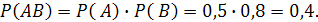 ) = 0,9. Тогда, вероятность того, что оба узла работают, найдем по теореме умножения вероятностей независимых событий: Пример 5. Студент знает 20 вопросов из 40 по первому разделу и 40 из 50 вопросов по второму разделу. На экзамене ему случайным образом предлагается ответить на вопросы из обоих разделов. Найти вероятность того, что студент ответит правильно: 1) на оба вопроса; 2) только на один вопрос; 3) хотя бы на один вопрос. Решение. 1. Пусть событие А состоит в том, что студент ответит правильно на вопрос из первого раздела. Р (А ) = 20/40 = 0,5. Событие В – студент ответит верно на вопрос второго раздела Р (В ) = 40/50 = 0,8. Вероятность события В не зависит от того, ответит студент или нет на вопрос из первого раздела. События А и В независимы. Событие АВ – студент ответит правильно на оба вопроса. По теореме умножения вероятностей независимых событий: