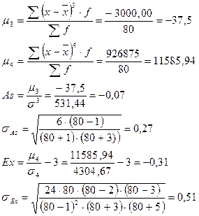 Далее рассчитываем показатели асимметрии, эксцесса и их ошибки: