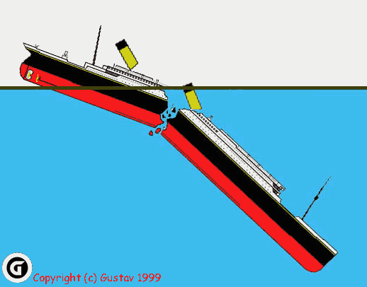 Н осовая часть опускается на дно, корма погружается в воду. На дно падает большое количество обломков.