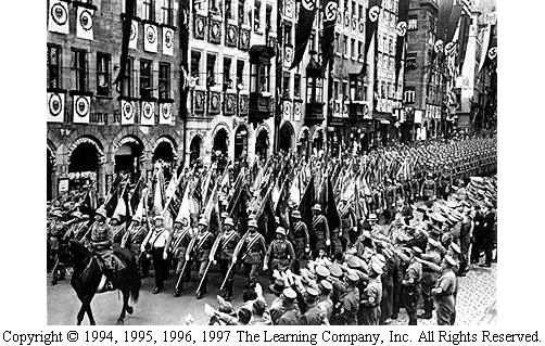 9. Марш нацистов по немецкому городу. В предвоенные годы НСДАП приобрела в Германии большой вес и популярность.