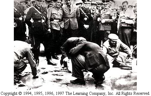 10. Вена, Австрия. Функционеры НСДАП наблюдают как евреи чистят улицы города. 1. Гаднелев К. С. Тоталитаризм как феномен ХХ-го века. Вопросы философии, 1992, № 2. 2. Герштейн Р. Э. Война которую выиграл Гитлер. Пер. с англ. Под общ. ред. Г. Ю. Пернавского. — Смоленск: Русич, 1996. 3. Загладин Н. В. Тоталитаризм и демократия: конфликт века. Кентавр, 1992, №№ 7-8. 4. Оруэлл Дж. “1984” и эссе разных лет. Москва: Прогресс, 1989. 5. Фест И. Гитлер: Биография. 3 тома/Пер. с нем. А. М. Андронова, А. А. Федорова. — Пермь: Культурный центр “Алетейа”, 1993. 6. Что есть что в мировой политике. Словарь-справочник. Москва: Прогресс, 1987. [1] Ibidem. S. 87. [2] Valentin Veit. The German People. N. Y., 1946. P. 633. [3] Mosse G. L. Intervista sul nazismo. Bari, 1977. P. 44. [4] Heuss Th. Hitlers Weg. Tuebingen, 1968 (1-е изд. 1932). S. XXXI. [5] Цит. по: Кин Ц. Итальянский ребус. М., 1991, с. 33. [6] Voelkischer Beobachter, 6.VI.1936. Цит. по: Schoeps J. H. Konservativismus — ein Denkstil der Vergangenheit? In: Die Mitarbeit, 1976, H. 4. S. 298. [7] Zitelmann R. Hitler. Selbstverstaendnis einer Revolutionaers. Hamburg, 1987. S. 458, 459, 460. [8] Ibidem. S. 457. [9] См.: Talmon J. L. Politischer Messianismus. Bd. 2, S. 444 f.; Эрнст Нольте и расценит структурные слабости либеральной парламентской демократии как предпосылку для возникновения мощных фашистских движений; см. его книгу с характерным названием “Кризис либеральной системы и фашистские движения”. [10] Так высказывался в те дни Гинденбург, см. Meissner H., Wilde H. Op. cit. S. 194. [11] Так писал Фридрих Франц фон Унру в серии статей под названием “Национал-социализм”, печатавшейся с 22 февраля по 3 марта 1931 года в “Франкфуртер цайтунг”. [12] Так писал Рудольф Гесс, бывший в одно время комендантом Освенцима, см.: Gilbert G. M. The Psychology of Dictatorship. New York, 1950, P. 250. [13] Nolte E. Faschismus in seiner Epoche, S. 507. [14] См. протоколы расширенного пленума Исполкома Коминтерна, Москва, 12-13 июня 1923 г., опубликованные в: Nolte E. Theorien, S. 92; это выступление интересно не в последнюю очередь тем, что в нем, в отличие от всех вошедших позднее в оборот левых теорий заговора, фашизм со всей серьезностью рассматривается как сборный пункт для разочаровавшихся в социализме масс. |