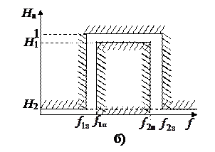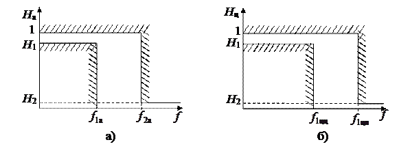 Рисунок 2 – Шаблон требований к частотной характеристике аналогового фильтра нижних частот: а – затухания; б – коэффициента передачи 3. Произвести операцию преобразования частоты для цифрового фильтра. Частоты f 1цп и f 2цп рассчитываются по формуле 1.4 (рис. 3):