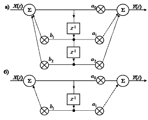 Рисунок 5.3 – Структурная схема каскадного соединения звеньев: а – схема фильтра нечетного порядка; б – схема фильтра четного порядка На рис. 5.4 изображены канонические звенья структурных схем первого и второго порядков.