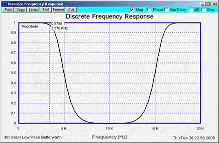 По этим формулам можно рассчитать АЧХ и ФЧХ фильтров. Приведем пример расчета значения для граничной частоты полосы пропускания данного фильтра: