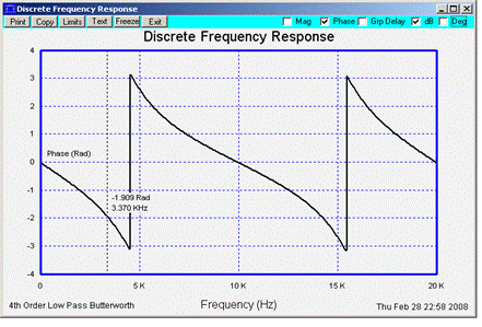 На рис. Д.2 и Д.3 изображены АЧХ и ФЧХ соответственно проектируемого цифрового ФНЧ Баттерворта, построен- ные с помощью программы Filter Solutions. На рис. Д.3 изображена ФЧХ с ложными скачками фаз на частотах 4,5 кГц и 15,5 кГц. Данные скачки обусловлены тем, что при построении графика арктангенс вычислялся в диапазоне от На практике зачастую пользуются групповым временем пробега входного сигнала (ГВП), поэтому многие программы имеют возможность построить этот параметр. На рис. Д.4 приведен график ГВП данного фильтра построенный с помощью программы Filter Solutions.