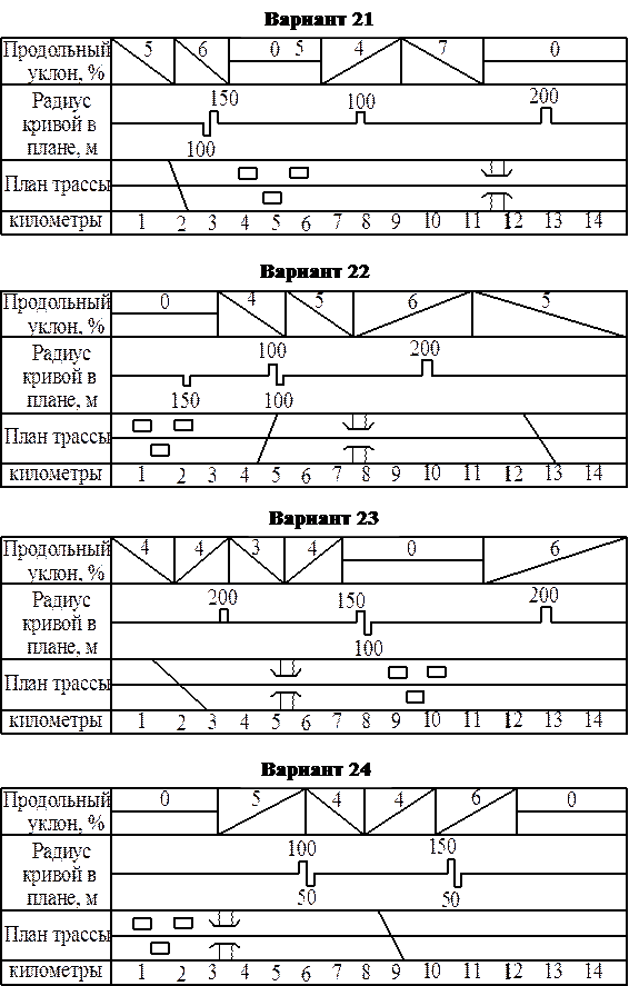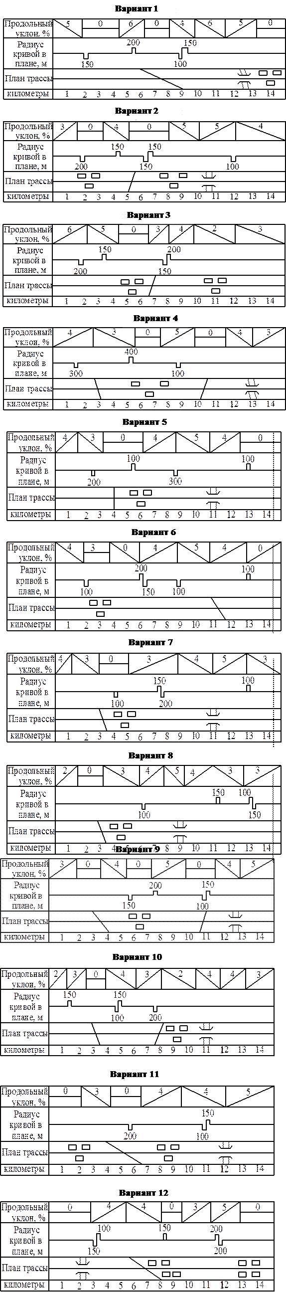 В пояснительной записке должны быть приведены расчеты определения скоростей движения по однородным участкам с учетом зависимости размеров и сочетания геометрических элементов дороги, выбор безопасных скоростей движения, коэффициентов безопасности и заполнение таблиц. Для определения пропускной способности участков дороги используются коэффициенты ее снижения в зависимости от влияния дорожных условий. Расчеты проводят в табличной форме. Коэффициенты аварийности также определяются в табличной форме. 4.3 Назначение мероприятий по устранению опасных мест на дороге На основе совместного анализа линейных графиков коэффициентов безопасности, уровня загрузки и коэффициентов аварийности определяют опасные участки и устанавливают мероприятия по повышению безопасности движения по автомобильной дороге. В таблицах В.1, В.2, В.3 Приложения В рекомендуются мероприятия, направленные на повышение безопасности движения по значениям коэффициентов безопасности, аварийности и уровня загрузки дороги движением 5 Графическая часть проекта Порядок построения и размещения плана трассы, радиусов поворота, продольного уклона, эпюр скоростей движения, коэффициентов безопасности, аварийности и загрузки дороги движением приведены в Приложении А. Предварительная компоновка листа с мероприятиями по устранению опасных мест на дороге предъявляются руководителю проекта для согласования. 6 Защита курсового проекта Выполненный проект студент представляет для рецензирования руководителю, а после проверки нормоконтролером – заведующему кафедрой для решения вопроса о допуске к защите. Защита курсового проекта производится пред комиссией, состоящей из преподавателей кафедры. При защите студент должен: – доклад, в котором сообщает о методах выявления опасных мест дороги и обоснования назначенных мероприятий по их устранению; – дать ответы на вопросы членов комиссии по проекту; – после защиты проекта пояснительная записка и чертежи с оценкой комиссии сдаются на кафедру для хранения. Сроки выполнения курсового проекта. Курсовой проект студентами дневной формы обучения выполняются в 6 семестре согласно графику самостоятельной работы, предусмотренной в Программе дисциплины для студента, а студентами заочной формы обучения – в 7 семестре. Литература 1 Бабков В.Ф. Дорожные условия и безопасность движения. – М. : Транспорт, 1993. – 272 с. 2 Бабков В.Ф. Автомобильные дороги: учебник для вузов. – М. : Транспорт, 1983. – 280 с. 3 Бабков В.Ф., Андреев О.В. Проектирование автомобильных дорог: учеб. для вузов Т 1, 2. – М. : Транспорт, 1979. – 780 с. 4 Васильев А.П. Состояние дороги и автомобилей в сложных погодных условиях. – М. : Транспорт, 1976. – 224 с. 5 Клинковштейн Г.И. Организация дорожного движения: учеб. – М. : Россия. Транспорт, 1997. – 300 с. 6 КоноплянкоВ.И. Организация дорожного движения: учеб. для вузов. – М. : Транспорт, 1991. – 183 с. 7 Кременец Ю.А. Технические средства дорожного движения: учеб. для вузов. – М. : Россия. Транспорт, 1990. – 324 с. 8 Ремонт и содержание автомобильных дорог: справочник инженера – дорожника / Под ред. А.П. Васильева. – М. : Транспорт, 1989. – 288 с. 9 Самойлов Д.С., Юдин В.А. Организация и безопасность городского движения: учеб. для вузов. – М. : Россия. Высшая школа, 1981. – 215 с. 10 Сильянов В.В. Транспортно-эксплуатационные качества автомобильных дорог. – М. : Транспорт, 198
