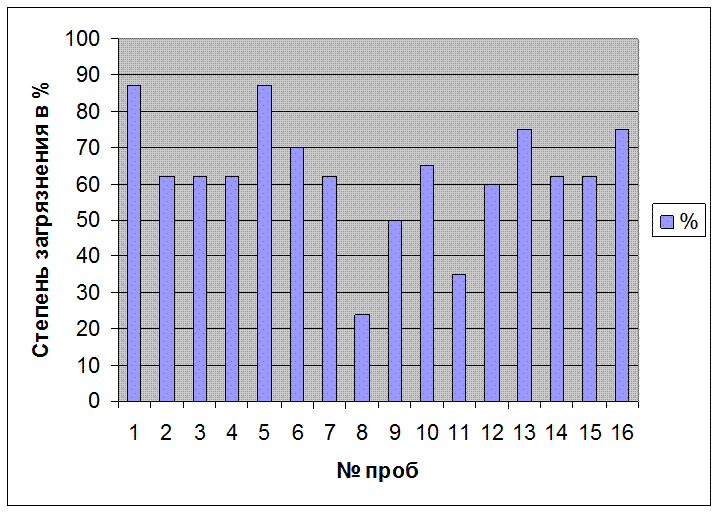 Таким образом, концентрация меди превышает ПДК в 15-ти пробах из 16, концентрация кобальта выше ПДК в 7 пробах из 16, никеля - в 14, цинка - в 15, свинца - в 10, хрома - в 1, а концентрация марганца ни в одной пробе не превышает ПДК. Формула, по которой рассчитывается % распределение загрязнения по придорожной зоне ул. Октябрьской: