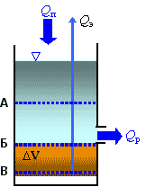 Это основное уравнение баланса эксплуатационного водоотбора. Его физический смысл: отрицательное (по балансовому знаку) изменение Вопрос о долевом соотношении возможных источников формирования ЭЗ в каждом случае очень сложный (от 0 до 100%); для самых простых расчетных схем могут быть применены аналитические решения, для сложных (точнее, реальных) - используется моделирование фильтрации. Принципиально важно: величина (или само существование) каждой компоненты БСЭВ определяется конкретной гидрогеодинамической ситуацией, т.е. зависит от параметров, граничных условий, времени, схемы и расположения водозабора и др. Простые балансовые упражнения: водоносный горизонт в виде сосуда