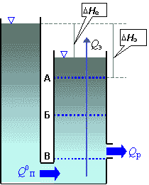 Рис. 3. II. Расход питания Реализуем такой механизм добавлением еще одного сосуда с более высоким положением уровня (аналог смежного водоносного горизонта). Питание происходит за счет разности уровней - в ненарушенных условиях при Варианты соотношения дебита водоотбора и расхода питания: А) - какой режим уровней при водоотборе? Стационарный. - где будет располагаться уровень? Выше уровня разгрузки (но выше, чем в варианте II . Почему?) - какие произойдут балансовые изменения? Уменьшится расход разгрузки на величину - общий вид балансового уравнения: Б) Стационарный режим, но уровень будет располагаться выше уровня разгрузки, т.е. разгрузка не инверсируется полностью. Принципиальный вид балансового уравнения сохраняется: В) Наконец, даже в случае превышения величины водоотбора над расходом питания Вид балансового уравнения прежний: Хотелось бы надеяться, что у внимательного читателя уже возник принципиальнейший балансовый вопрос: а почему же уровень в смежном сосуде -"горизонте" остается постоянным? Действительно, картинка на рис. 1.7 не содержит информации о механизме собственного питания второй емкости. Какие варианты здесь возможны ? - Если питания нет, то даже в естественных условиях не могла бы существовать разность уровней - А если есть естественное питание, то каков его механизм? Как оно себя поведет при снижении уровней в этой связанной системе? Таким образом, возникает теоретически бесконечная цепочка балансовой реакции на эксплуатационный водоотбор. Практически же где-то может найтись такая питающая граница, которая выдаст необходимое приращение питания без изменения собственного уровня (точнее, при пренебрежимо малом изменении уровня) - обычно это большие реки, крупные водоемы и т.п. Итак: стационарный режим фильтрации при работе водозабора может установиться только в том случае, если в области влияния водозабора есть питающие и/или дренирующие границы, на которых в связи с понижением уровней произойдет суммарное изменение естественных величин питания и/или разгрузки, равное величине водоотбора: