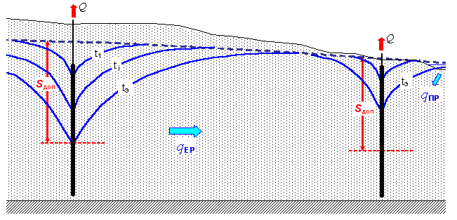 ПРИ ЭКСПЛУАТАЦИИ: водоотбор - новая расходная статья баланса (искусственная разгрузка). Поэтому после включения водозабора начинает формироваться (в полном соответствии с законами систем материального мира) новое равновесное балансовое состояние, т.е. происходят количественные изменения естественных балансовых процессов, стремящиеся компенсировать возникший за счет водоотбора дисбаланс. В совокупности эти изменения таковы: - уменьшается объем воды в пласте на величину - может увеличиться суммарный расход питания до величины - может уменьшиться суммарный расход разгрузки до величины Почему питание увеличивается, а разгрузка уменьшается ? - Если питание имеет "потенциальный" характер, т.е. происходит под действием разности напоров (перетекание из смежного горизонта, приток из рек), то при эксплуатационном понижении уровней разность напоров может только увеличиваться. - Если питание имеет инфильтрационный характер, то при понижении свободной поверхности инфильтрация тоже возрастает (до некоторого предела), так как уменьшается испарение. - Если естественная разгрузка происходит с некоторой разностью напоров на дренирующей границе (разгрузка в русла рек, водоемы, восходящими родниками...), то при эксплуатационном понижении напоров эта разность уменьшается - следовательно, уменьшается и расход разгрузки. - Если разгрузка происходит путем испарения, то при эксплуатационном понижении свободной поверхности величина испарения всегда уменьшается. Терминологическое замечание: процесс уменьшения естественной разгрузки при эксплуатации будем называть инверсией; она может быть частичной или полной. Итак, уравнение баланса водоносного горизонта при работе водозабора приобретает такой принципиальный вид:
