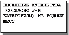 процентным охватом" вместо превращения коллективизации в средство для повышения эффективности сельскохозяйственного производства. Под сильнейшим нажимом сверху не только в передовых зерновых районах, но и в Чернозёмном центре, и в Московской области, и даже в республиках Востока выносились решения завершить коллективизацию "в течение весенней посевной кампании 1930 года" Разъяснительная и организационная работа в массах подменялась грубым нажимом, угрозами, демагогическими обещаниями. Итак, провозглашены насаждение колхозов и раскулачивание на базе сплошной коллективизации. Критерии отнесения хозяйства к категории кулацкого были определены столь широко, что под них можно было подвести и крупное хозяйство, и даже бедняцкое. Это позволяло должностным лицам использовать угрозу раскулачивания как основной рычаг создания колхозов, организуя давление деклассированных слоёв деревни на остальную её часть. Раскулачивание должно было продемонстрировать самым неподатливым непреклонность властей и бесполезность всякого сопротивления. Сопротивление кулачества, а также части середняков и бедноты коллективизации было сломлено жесточайшими мерами насилия (см. рис2). Неизвестны пока данные, сколько человек погибло с "раскулачиваемой" стороны как в процессе самого раскулачивания, так и в результате выселения в необжитые районы. Исторические источники приводят разные данные о числе раскулаченных и выселенных хозяйств. Называются следующие данные: к концу 1930 г. раскулачено около 400 тыс. хозяйств (т.е. примерно половина кулацких хозяйств), из них выселено в отдельные районы около 78 тыс., по другим данным - 115 тыс. Хотя Политбюро ЦК ВКП(б) ещё 30 марта 1930 г. вынесло постановление о прекращении массового выселения кулаков из районов сплошной коллективизации и предписало проводить его только в индивидуальном порядке, число выселенных хозяйств в 1931 г. возросло более чем вдвое - почти до 266 тыс. Раскулачиваемые делились на три категории. К первой относился "контрреволюционный актив" - участники антисоветских и антиколхозных выступлений (они сами подлежали аресту и суду, а их семьи - выселению в отдалённые районы страны). Ко второй - "крупные кулаки и бывшие полупомещики, активно выступавшие против коллективизации" (их выселяли вместе с семьями в отдалённые районы). И, наконец, к третьей - "остальная часть кулаков" ( она подлежала расселению специальными посёлками в пределах районов прежнего своего проживания). Составлением списков кулаков первой категории занимался исключительно местный отдел ГПУ. Списки кулаков второй и третьей категорий составлялись на местах с учётом "рекомендаций" деревенских активистов и организаций деревенской бедноты, что открывало широкую