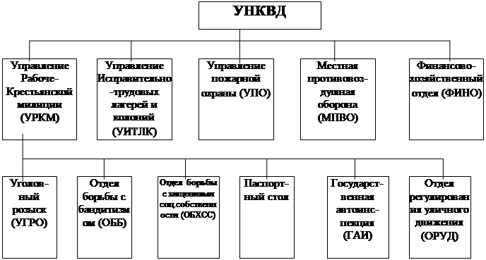 Введение. Более полувека прошло с тех пор, как Советский Союз и его вооруженные силы одержали историческую победу в Великой Отечественной войне 1941-1945 гг. В героической истории нашей Родины она занимает особые страницы, раскрывающие борьбу советских народов за свою свободу и независимость. Немало героических страниц в история самой страшной войны XX столетия вписали войска НКВД. Об этих государственных структурах высказано немало суждений и их деятельности даются разные оценки, причем , порой, полярные друг другу. естественно, органы, стоявшие на защите безопасности и правопорядка, не всегда вызывают симпатии у граждан, и особенно тогда, когда им приходится действовать в особых условиях. В мирное время для внутренних войск не были предусмотрены многие вопросы, которые пришлось решать во время войны, однако структура этих войск показала свои способность к быстрой адаптации к новым условиям, к быстро меняющейся оперативной обстановке. Война вызвала к жизни принятие целого ряда документов, регламентирующих как жизнь в стране в целом, так и действия войск НКВД, принимаемых как на самом высоком уровне, так и на уровне отдельных фронтов. Сотрудники органов внутренних дел часто подключались к операциям, не свойственным данной структуре, резко возросла нагрузка на их сотрудников, несовершенство и даже некоторая противоречивость правовой базы их деятельности позволяла вышестоящим войсковым структурам “загружать” войска НКВД исключительно сложными дополнительными задачами. Однако через ошибки, потери, трудности различного характера, задачи внутренних войск во время войны все же были выполнены, в стране не был допущен хаос , тыл действующих армий был надежно защищен. И сейчас, в условиях все усиливающейся криминализации общества, очень важен опыт прошлых лет, позволяющий узнать, как правоохранительные структуры в условиях войны решали особые, специфические задачи, характерные лишь для особого, чрезвычайно сложного периода, поскольку в этих условиях наряду с число профессиональными задачами мирного времени возникали и успешно решались задачи, касающиеся только военной обстановки. 1. Органы внутренних дел к началу войны. К Великой Отечественной войне войска Наркомата внутренних дел подошли составом в 173924 человека ( на 1 июня 1941 г), в т.ч. оперативные войска - 27,3 тыс. человек( без учета военных училищ), по охране железных дорог - 63,7 тыс., по охране особо важных предприятий промышленности - 29, 3 тыс., конвойные - 38, 2 тыс. . 1 Командующим всеми войсками НКВД являлся заместитель наркома НКВД СССР комдив И.И.Масленников. Помимо войск в структуру НКВД - Народного комиссариата внутренних дел СССР - входили : Главное управление государственной безопасности (НКГБ), Главное управление милиции (ГУМ), Управление пожарной охраны (УПО), Управление по делав военнопленных и интернированных, Главное управление лагерей (ГУЛАГ), Главное управление строительства шоссейных дорог (ГУСШОДОР), Управление картографии и геодезии. 2 Как пример можно привести структуру Управления НКВД г. Ленинграда, которая отражает все основные функции войск НКВД, возлагаемые на них к началу войны, приведенный на рис. 1. 3 В условиях начавшейся войны в дополнение к основным задачам по охране общественного порядка и борьбе с преступностью появилось много новых : борьба с нарушит