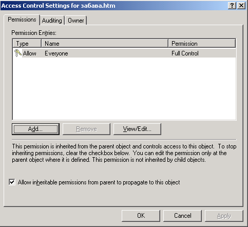 Рис.3 5. Выделить имя каждого пользователя в списке Name (Имя) и щелкнуть на Allow (Разрешить) или Deny (Запретить), чтобы вызвать соответствующее действие. Если пользователю или группе необходимо присвоить особый набор разрешений, следует щелкнуть на вкладке Advanced (Дополнительно), чтобы открыть диалоговое окно «Элемент разрешения», а затем щелкнуть на кнопке View/Edit (Показать), чтобы указать индивидуальные настройки. Если перед тем, как щелкнуть правой кнопкой мыши и выбрать пункт Properties (Свойства), вы выделили несколько папок или файлов, изменения повлияют на все выделенные объекты. Если существующие разрешения не одинаковы для всех выделенных объектов, появится соответствующее сообщение. Если щелкнуть на кнопке Yes (Да) в этом сообщении, система изменит разрешения для всех выделенных объектов на наследованные и удалит все явно указанные разрешения сделанные до того. Именно здесь можно извлечь пользу из разрешений, полученных по наследству. Чтобы изменить разрешения для папки и всех папок и файлов, которые она содержит, необходимо выполнить следующие действия: 1. Вывести на экран вкладку Security (Безопасность) для папки и установить разрешения для всех пользователей, как было описано выше. Не следует щелкать на кнопке OK , чтобы не закрыть окно. 2. Щелкнуть на кнопке Advanced (Дополнительно). 3. На вкладке Permissions (Разрешения) в диалоговом окне Access Control Settings Reset Permissions On AllChild Objects And Enable Propagation Of Inheritable Permissions (Установить разрешения для всех дочерних объектов и разрешить их наследование) и щелкнуть на кнопке ОК. После получения вашего подтверждения настройки в окне сообщения, система проследит все файлы в папке, все подпапки и все файлы во всех подпапках. Для всех этих объектов будут удалены указанные выше разрешения и присвоены “наследуемые” разрешения. Таким образом, у всех объектов окажутся те же разрешения, что и у родительской папки.[2] 4. Присвоение файла или папки Каждый файл или папка в томе NTFS имеет владельца, то есть человека, который осуществляет контроль за разрешениями для объектов и присваивает их другим пользователям. Создатель нового файла является его началльным владельцем. Для обнаружения того, кто является владельцем файла или папки, следует выполнить такие действия: 1. Щелкнуть правой кнопкой мыши на файле или папке в Проводнике и выбрать пункт Properties (Свойства). 2. Щелкнуть на вкладке Security (Безопасность) и щелкнуть на Advanced (Дополнительно). 3. Щелкнуть на вкладке Owner (Владелец), чтобы открыть диалоговое окно «Параметры управления доступом для НР_file на DRIVE ». В поле Current Owner Of This Item (Текущиц владелец этого элемента) будет указано имя владельца. Иногда приходится присваивать «чужой » файл или папку. Например, если владелец файла больше не хочет им заниматься, системный администратор может присвоить файл себе или другому пользователю, или другой пользователь может присвоить файл напрямую. Для присвоения файла или папки необходимо иметь разрешение Take Ownership (Смена владельца), которое включено в разрешение Full Control (Полный доступ). Чтобы получить такое разрешение, необходимо получить разрешение на полный доступ у администратора или владельца файла, который также обладает полным доступом. Для присвоения файла или папки необходимо: 1. Вывести на экран вкладку Owner (Владелец) диалогового окна Access Controll Settings (Параметры управления доступом). 2. Выделить в спи