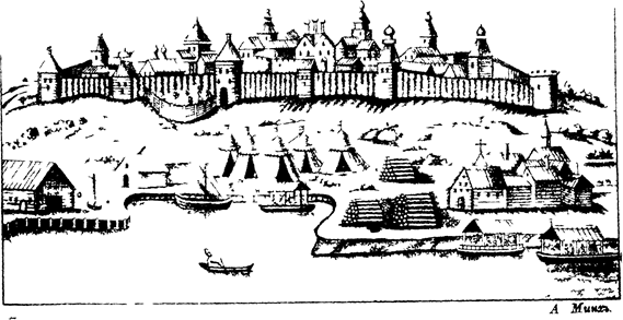 Общии вид Царицына (1636 г. С рисунка Адама Олеария) Основанием города принято считать дату царской грамоты «казанскому воеводе Кн. Григ. Осиповичу Засекину да Роману Вас. Ольферову, да Ивану Аф. Нащекину на переволоке острог сделать». Грамота была помечена 2 июлем 1589 г, Город получил название от острова Царицын и р. Царица, а те в свою очередь образовались от созвучия татарских слов Сары-Су (желтая вода), Сары-чин (желтый песок). Впрочем на этот счет существуют и другие предания. В сохранившихся архивах от начала ХVII столетия содержится описание города уже на правом берегу. Наиболее полное из них и к тому же иллюстрированное принадлежит Адаму Олеарию, секретарю Гольштинского посольства, проплывавшего по Волге в 1632 г.: «Город Царицын находится в 350 верстах от Саратова, лежит на правом берегу на холме, невелик, построен в форме параллелограмма и заселен одними стрельцами, которых живет в нем 400 человек. Стрельцы эти обязаны держать стражу против татар и казаков и служить охраной для проходящих мимо судов».[1] Крепость, согласно тому же источнику, имела размеры в пределах «80 сажен в длину и 40 в ширину. Была окружена деревянной крепостной стеной с двенадцатью башнями и усилена по периметру рвом». Под защитой крепости постепенно о6разовались посады, состоящие из деревянных домов ремесленников, рыбаков и разного белого люда. Выбор территории для крепости, ее архитектура и укрепление соответствуют тем приемам, которые сложились в русском градостроительстве в середине ХVI столетия и получили распространение как в Поволжье, так и в Сибири. В отличие от старых русских кремлей и монастырей сооружений, возводимых из камня, крепости, построенные на вновь отвоеванных землях Поволжья и Сибири, возводились наскоро из дерева. Место для нового города в военном отношении было удобным—крутой берег Волги и р. Царица создавали естественные условия для организации защиты. Внутри крепости находились управа, воеводские здания и избы для стрельцов. В то время, как вышерасположенные города-крепости постепенно теряли свое стратегическое значение. Царицын почти до конца ХVIII столетия, т. е. более 200 лет носил исключительно военно-крепостной характер. В 1689 г. были упразднены все ранее созданные по Волге заставы, кроме Царицына, где стрельцы, предназначенные для охраны южных границ, составляли основную часть населения и где постоянно поддерживался строгий порядок. Объясняется это все тем же географическим положением Царицына в Нижнем Поволжье, где длительное время сохранялось сложное военно-стратегическое положение. Находясь под постоянной угрозой вражеских вторжений, все понизовье представляло собой незаселенное дикое поле. А между тем его просторы, богатые охотничьими, рыбными и другими угодьями, привлекали к себе беглый люд, из которого со временем наряду с Донским образовалось еще и более беспокойное и воинственное Волжское казачество. Здесь же издавна кочевали Ногайская орда, а в 1632 г. к левому берегу Волги прикочевали калмыки. Ногайская орда перешла на правый берег. И те и другие находились в постоянных столкновениях с Донским и Волжским казачеством. Калмыки в этих условиях то искали защиты у русского царя, то устраивали опустошительные набеги на его города. Постоянной угрозой для южных границ была Крымская орда, находившаяся под влиянием султанск