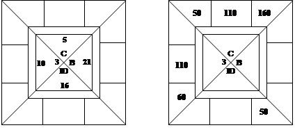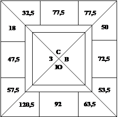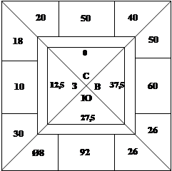 – 14,5 – 27,5 – 25 + 25 – 63 – 10 – 102,5 – 12,5 + 63 +14,5 +10 = +87,5 Так как итоговые суммы имеют дробную часть, то для того, чтобы потом деление шло без остатка, в исходном положении спишем с горы игрока С одно очко, а в строку вистов других трех игроков напишем по два виста на С. Тогда после вычета наименьшей горы получим такую запись: