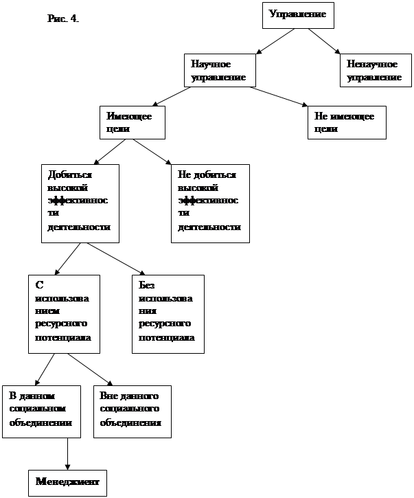 Теперь объединим отдельные признаки менеджмента, т.е. произведем обобщение : · Управление чьей-либо деятельностью; · С использованием науки управления; · Цель – достижение высокой эффективности деятельности, лучшее использование ресурсного потенциала; · В данной социальной группе (организации, фирме, компании). b.) Определение менеджмента и проверка его правильности. Определение – это логическая операция, которая раскрывает содержание понятия. В явном определении понятия, содержание которых надо раскрыть, называется определяемым понятием (definiendum – Dfd), а то понятие, с помощью которого оно определяется, называется определяющим понятием (definience – Dfn). На основании логических приемов формирования понятия “менеджмент” произведем его определение (или дефиницию). Менеджмент – это процесс научного управления чьей-либо деятельностью с целью достижения ее высокой эффективности, лучшего использования ресурсного потенциала данного социального объединения. Содержание понятия менеджмент выведено с помощью логической операции определения через род и видовое отличие A=BC, где А- определяемое понятие (менеджмент), В- род (научное управление), С- видовое отличие (с целью достижения ее высокой эффективности, лучшего использования ресурсного потенциала данного социального объединения). Проверим выведенное определение по правилам составления определения, а также выясним отношение объема и содержания. 1. Правило соразмерности объемов: объем определяющего понятия должен быть равен объему определяемого понятия. При нарушении этого правила могут возникать следующие логические ошибки в определении: · Широкое определение – объем Dfn больше Dfd. Например, опустив в Dfn слово “научное” [управление], мы получим определение, в результате которого управленческую деятельность вождя первобытного племени, следящего за сбором плодов, можно назвать менеджментом. Или, убрав “социальное объединение”, мы получим определение, согласно которому управление автоматизированными системами является менеджментом. · Узкое определение – объем Dfn меньше объема Dfd. Например, определив менеджмент как процесс научного управления с целью … получения прибыли, мы увеличим содержание, но уменьшим объем, так как теперь управленческая деятельность в некоммерческих организациях не будет являться менеджментом. Другой пример: менеджмент – это процесс … управления производством и производственным персоналом. Значит, управление социальными ресурсами, если оно не касается конкретно производства товаров и услуг, не является менеджментом. · Определение в одном отношении широкое, в другом узкое – т.е. объем Dfd больше и меньше объема Dfn (в разных отношениях). Например: менеджмент – это совокупность мер … по управлению предприятием. С одной стороны, мы имеем ввиду любые формы управления, в том числе без использования научного подхода (увеличение объема), но – на базе одного предприятия (уменьшение объема). Вывод: в данном нами определении нельзя убрать или добавить существующие признаки из-за соразмерности определяемого и определяющего понятий. Закон обратного отношения между объемом и содержанием понятия выполнен. 2. Правило запрета круга. Круг возникает тогда, когда Dfd определяется через Dfn, а Dfn было определено через Dfd. Круг возникает, если определяемое понятие характе