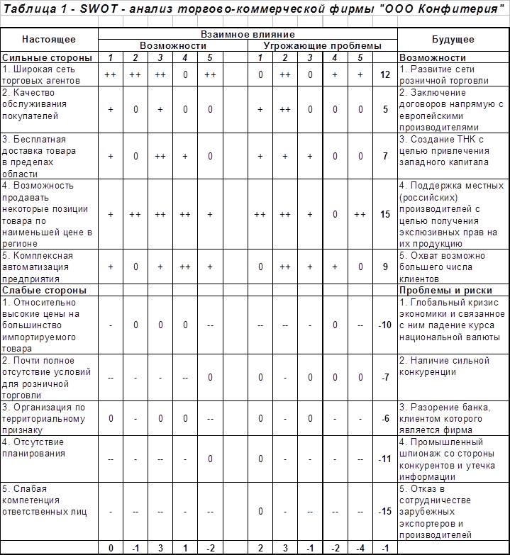 Сильные стороны: 1. Широкая сеть торговых агентов – фирма содержит около 18-ти торговых агентов в городе и примерно еще 7 – по области. 2. Качество обслуживания покупателей – заключается в персональном подходе к каждому покупателю. 3. Бесплатная доставка товара в пределах области – привлекающий элемент. На самом деле стоимость доставки включена в стоимость товара. 4. Возможность продавать некоторые позиции товара по наименьшей цене в регионе – существует благодаря соответствующим образом заключенным договорам на закупку крупных оптовых партий товаров. 5. Комплексная автоматизация предприятия – достигнута в результате тесного сотрудничества программистов фирмы с остальными сотрудниками и позволяет быстро обрабатывать огромные массивы данных. Слабые стороны: 1. Относительно высокие цены на большинство импортируемого товара – в стоимость товара приходится закладывать возможный рост курса доллара. 2. Почти полное отсутствие условий для розничной торговли – в настоящее время преобладает оптовая торговля со складов, отсутствуют собственные розничные магазины. 3. Организация по территориальному признаку – основной склад и оффис фирмы находятся далеко от делового центра города. 4. Отсутствие планирования – до текущего момента не предпринималось попыток анализа, прогнозирования и планирования деятельности фирмы. 5. Слабая компетенция ответственных лиц – ответственные лица на местах не имеют должного уровня компетентности. Возможности: 1. Развитие сети розничной торговли – аренда/строительство собственных розничных магазинов. 2. Заключение договоров напрямую с европейскими производителями – предполагает поиск и ведение переговоров. 3. Создание ТНК с целью привлечения западного капиталла – предполагает интеграцию с западными экспортерами для обеспечения свободных миграций капиталла. 4. Поддержка месных (российских) производителей с целью получения экслюзивных прав на их продукцию – предполагает разработку и внедрение инвестиционных проектов. 5. Охват возможно большего числа клиентов – предполагает дальнейшее развитие агентской сети. Проблемы и риски: 1. Глобальный кризис экономики и связанное с ним падение курса национальной валюты . 2. Наличие сильной конкуренции – на рынке товаров, предлагаемых «ООО Конфитерия», идет борьба за клиентов. 3. Разорение банка, клиентом которого является «ООО Конфитерия» – банк «СБСАгро». В результате – потеря денег, хранящихся на расчетном и валютном счетах. 4. Промышленный шпионаж со сторны конкурентов и утечка информации – всякая деятельность конкурентов, направленная на сокращение потенциала фирмы. 5. Отказ в сотрудничестве зарубежных экспортеров и производителей – обуславливается различными причинами, в основном – нестабильным состоянием экономики страны. По результатам SWOT – анализа фирмы «ООО Конфитерия» можно сделать вывод о несколько нестабильном текущем положении фирмы на рынке. 2. Оценка факторов, оказывающих влияние на клиентов торгово-коммерческой фирмы "ООО Конфитерия". Клиентами фирмы являются как юридические (фирмы) и физические (частные предприниматели) лица, так и частные лица. Исходя из этого, можно выделить ряд факторов, влияющих на поведение этих двух групп клиентов. Далее в порядке убывания значимости перечислены факторы, влияющие на юридических и физ