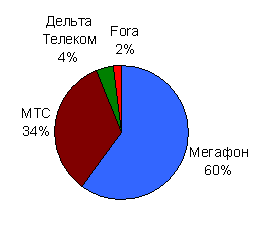 Введение на 01.01.2003 года в России абонентами сотовых операторов являются около 17,8 млн. человек, то есть примерно 11-12 процентов от численности населения РФ, по данным сайта www.amobile.ru . эти цифры соизмеримы с уровнем распространения мобильной связи в странах Восточной Европы, но ниже, чем в странах Западной Европы, где мобильными телефонами пользуется около 70% населения, Японии – 55%, США – 45%, а также в странах Балтии – от 15% до 35%. В Санкт-Петербурге число абонентов сотовой связи (около 2 млн. человек) превысило число абонентов фиксированной проводной связи (около 1,9 млн. человек), а в ряде регионов количество абонентов фиксированной мобильной связи становится соизмеримым. Целью реферата является изучить рынок операторов сотовой и связи г. Санкт-Петербурга. 1. Рынок сотовой связи Санкт-Петербурга На сегодняшний день в нашем городе в коммерческой эксплуатации находятся сотовые сети следующих стандартов: - аналоговый NMT(Nordic Mobile Telefone) 450 – представлен компанией Дельта Телеком; - аналоговый AMPS/NAMPS – представлен компанией FORA Communications; - цифровой GSM-900/1800 – представлен компанией Мегафон и МТС; - цифровой IS-95 (CDMA800) – представлен компанией Петросвязь; - цифровой IMT-MC-450 (CDMA2000, CDMA-450) – представлен компанией СКАЙЛИНК (SkyLink). В Петербурге и Ленинградской области работают 6 компаний, предоставляющих услуги сотовой связи (ОАО "МегаФон", ОАО "Телеком XXI" (торговая марка МТС), ЗАО "Дельта Телеком", ОАО "Облком" (торговая марка FORA Communications), ОАО "Санкт-Петербург Телеком" (торговая марка FORA Communications), ЗАО "Петросвязь"), и около двух десятков компаний местной, междугородной и международной телефонной связи. Крупнейшие из них: ОАО "Северо-Западный Телеком", ОАО "Ленсвязь", ЗАО "ПетерСтар", ООО "Совинтел". Уже сегодня становится ощутима конкуренция между мобильными и проводными операторами. "Ее ужесточению способствуют востребованность и удобство мобильной связи, выгодные тарифные программы и услуги сотовых операторов, а также возможность введения фиксированными операторами повременной оплаты разговоров", - делится Юлия Мусатова, директор по маркетингу ОАО "Санкт-Петербург Телеком". На сегодняшний день в Санкт-Петербурге обслуживается около 2 млн. абонентов - долю рынка каждого оператора можно увидеть на рис.1.