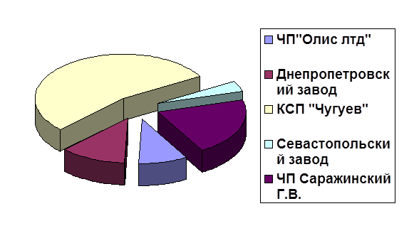 Рисунок 2.2 Основные поставщики сырья и материалов. Экологические факторы. Промышленная деятельность почти всегда наносит вред состоянию окружающей среды. Состояние окружающей природной среды, озабоченность общественности по поводу экологической безопасности сказываются и на товарах, производимых фирмами, и фирмах которые их реализуют, соответственно и на успешности их продвижения на рынке. Конкуренты. Следует отметить, что рынок Луганской области, на котором работает КФХ «Людмила» характеризуется наличием большого количества фирм предлагающих однотипную с данным предприятием продукцию, а значит уровень конкуренции велик. Контактные аудитории. Нежелательные контактные аудитории, с которыми в своей работе сталкивается предприятие - это сан станция, налоговая инспекция, К желательным контактным аудиториям можно отнести средства массовой информации. Потребители. К потребителям продукции реализуемой КФХ «Людмила» можно отнести население, а также посреднические организации. Определение сильных и слабых сторон предприятия невозможно без анализа внутренней среды предприятия. При функциональном подходе выделяют шесть направлений деятельности предприятия: финансы, менеджмент, маркетинг, производство, кадры и технология. На КФХ «Людмила» функции маркетинга и менеджмента выполняет коммерческая служба. Для того чтобы ситуационный анализ был полным, необходимо рассмотреть комплекс маркетинга предприятия по четырем группам факторов: продукт, цена, каналы сбыта, продвижение товаров на рынке. Продукт. Продукция, реализуемая КФХ «Людмила» обладает достаточно высокой конкурентоспособностью вследствие хорошего качества и оптимальной цены. Цена. В целом ассортимент реализуемой продукции обладает гибким ценовым диапазонам. В нем сочетаются цены доступные людям с невысоким уровнем дохода, средним уровнем доходов, так и высоким. Каналы сбыта. Собственная сбытовая сеть у КФХ «Людмила» представлена магазином реализующим помимо продуктов питания ликероводочную продукцию, а также несколько точек на рынках станичнолуганского района и Луганска. Продвижение товаров на рынке. КФХ «Людмила» следующие методы: периодическая реклама в газете «Экспресс - клуб», почтовая рассылка предоставление гибкой системы скидок постоянным клиентам, предоставление бонусов и проведение всевозможных акций совместно с товаропроизводителем. Произведем оценку с помощью метода многомерного шкалирования (таблица…). Используя пятибалльную шкалу, оценим каждое направление деятельности КФХ «Людмила» и на основе этого анализа следует рассчитать коэффициент адаптации предприятия к его маркетинговой среде. Данный коэффициент является интегрированным и позволяет предприятию в общем оценить свой потенциал. Коэффициент адаптации равен отношению суммы выставленных к сумме максимально возможных, в данном случае двадцати, формула 2.1.