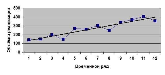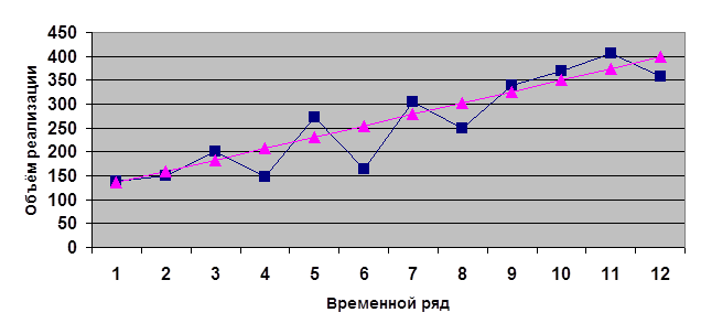 В соответствии с полученными результатами определился коэффициент детерминированности г2 = 0,867. Его значение показывает, что вариацию реализации (у) можно практически полностью объяснить влиянием включенного в модель временного ряда. На долю остальных, не учтенных в явном виде факторов, приходится 11,1 % вариации выходной функции. Такую же величину нам показал и тренд линейного типа, представленный на рисунке 3.3. Для этого на графике, показывающем динамику развития во времени добавим данный тренд.