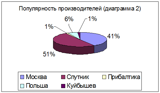 Периодичность покупок конфет очень различна среди потребителей. К сожалению не было возможности по анкете проанализировать зависимость периодичности и количества покупаемых конфет от уровня дохода семьи, так как включение вопросов о доходе в анкету привело бы к тому, что многие не слали бы на нее отвечать. Делая же анализ по полученным данным мы выяснили, что 33 человека из опрошенных (43%) покупают конфеты на праздники. С другой стороны 27 опрошенных (36%) покупают конфеты с периодичностью в один месяц, 12% опрошенных заявили что покупают конфеты каждую неделю. Причем 11 из 27 покупающих конфеты ежемесячно берут от 500 до 1000 грамм, а 7 человек от 200 до500 грамм. Из тех кто покупает конфеты на праздник 17 покупают от 500 грамм до 1 кг. Как видно большинство опрошенных покупает конфеты не часто (79%) и берут не очень много (до 1 кг) это свидетельствует о низком уроне доходов. Если подсчитать приблизительно среднегодовое потребление в городе Хабаровске то получим – 750 * 12 / 3 = около 3 кг. Где 750 – среднемесячная покупка развесных конфет 12 – месяцы 3 – средний по выборке состав семьи Однако не следует делать вывод о том, что люди не едят сладостей просто если взять среднее по России потребление кондитерских изделий – 11.5кг и эти 3 кг. То получим, что доля развесных конфет в общем потреблении сладостей составит лишь 26%. На основе проведенного опроса выяснилось, что большинство потребителей на рынках России отдают предпочтение шоколадным конфетам отечественного производства. Причем эта тенденция прослеживается как в крупных городах так и в небольших населенных пунктах (п. Березовка). При анализе ситуации на рынке города Хабаровска были выявлены следующие тенденции: наибольшее число опрошенных лиц как потребителей и потенциальных покупателей лидером потребительских предпочтений является АО Сптник, но не далеко от него отстали и московские производители (Бабаевское, Рот-Фронт, Большевик..) см Диаграмму 2.